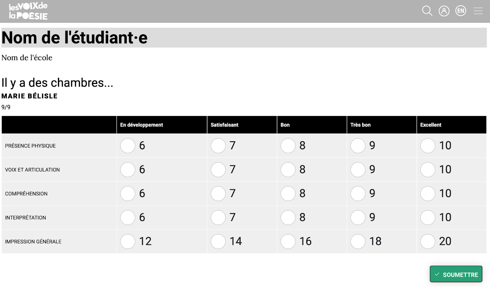 - Une fois le concours commencé, la première fiche d’évaluation apparaîtra sur votre écran. Si vous êtes juge de la précision, vous verrez le poème et la fiche d’évaluation de la précision, et non le formulaire de performance ci-dessous, mais le processus est exactement le même.